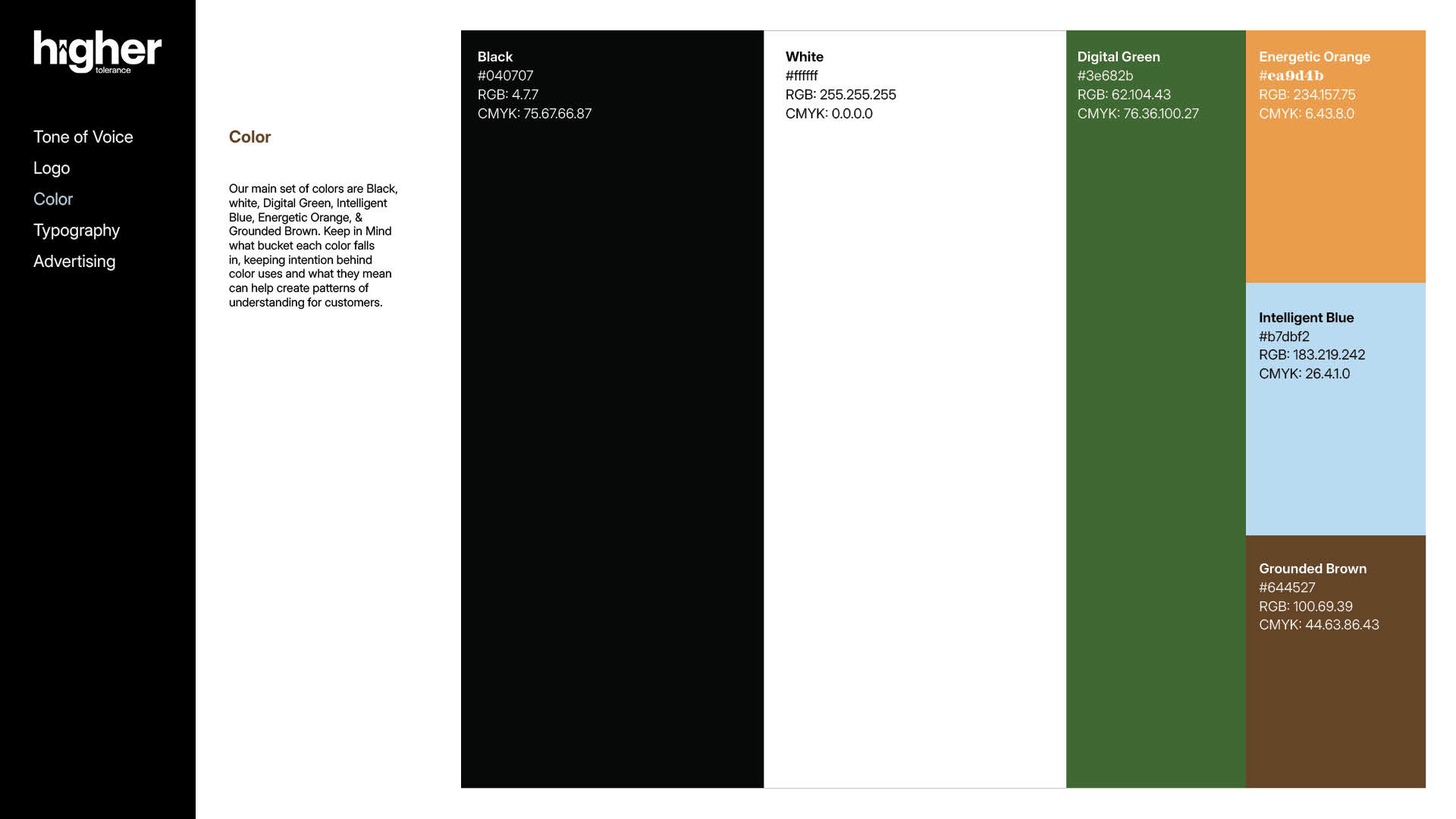 Higher Tolerance was created to connect with young professionals (ages 21–35) by positioning itself as a trusted authority in the cannabis space. The brand’s design foundation is clean, intelligent, and sophisticated—crafted to let vibrant brand partners shine through while maintaining a strong, credible presence. The tone and visuals reflect a balance of creativity and professionalism, aligning with the brand's strategic vision.
